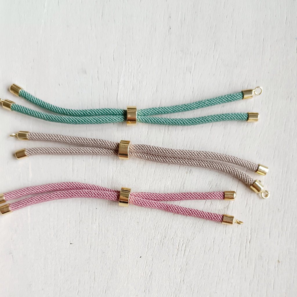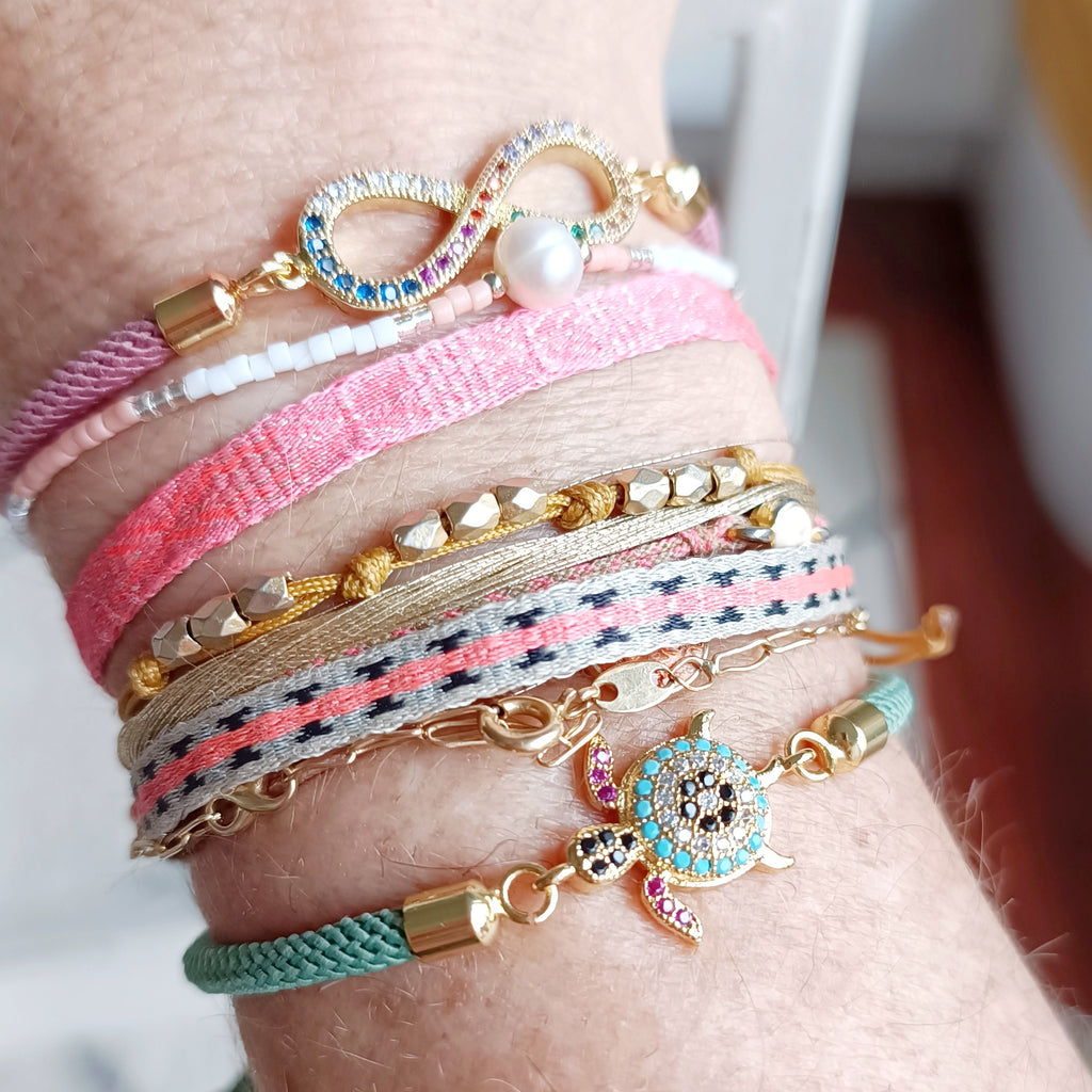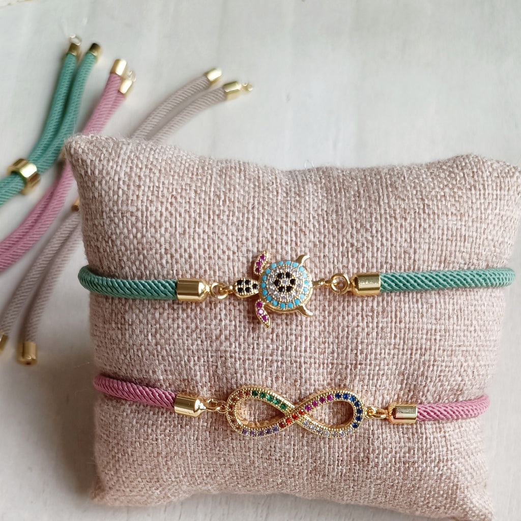 El cordón de poliéster tiene un grosor de 2.5 mm que hace que la pulsera sea muy vistosa y los charms de microlatón galavanizado de alta calidad e con baño de oro 18k al igual que todos los acabados añaden un toque de elegancia y calidad a esta hermosa pulsera, además de durarnos bonita a lo largo del tiempo