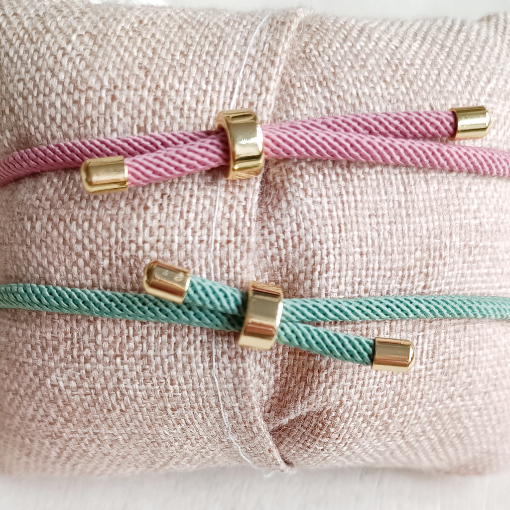 Esta pulsera está confeccionada con un cordón de poliéster resistente cuenta con una pieza trasera en dorado que permite ajustarla a cualquier tamaño de muñeca.